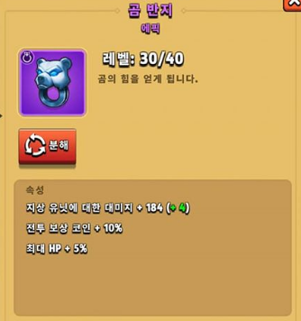 보스 챕터에서 추가 대미지를 얻을 수 있는 곰 반지입니다. 보스 챕터에서 출몰하는 지상 보스몬스터에 추가 대미지를 줄 수 있다는 장점이 있지만 지상 유닛에 대한 추가 대미지와 HP +5% 레어 능력으로 일반 챕터에서 부족함을 많이 보입니다. 챕터 후반에 갈수록 많은 장비를 보유하게 되는데 보스 챕터에서만 착용 하는 것을 추천합니다.