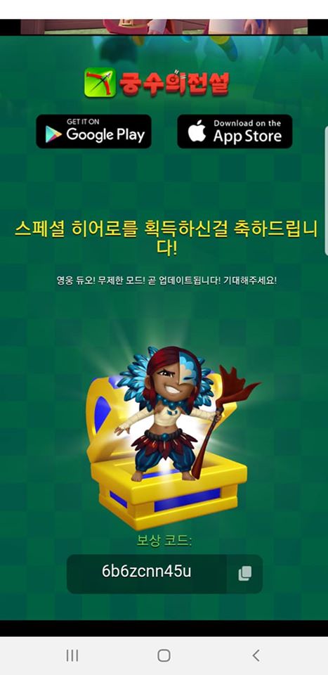 열쇠가 2개를 샤리 넣으니 보상 코드가 나오네요. 제가 갖고 있는 스마트폰 2개로 진행하였기 때문에 2개의 코드번호가 존재하는데 하나는 제가 사용하고 하나는 필요 없어서 공유합니다. 코드번호는 6b6zcnn45u 입니다.<