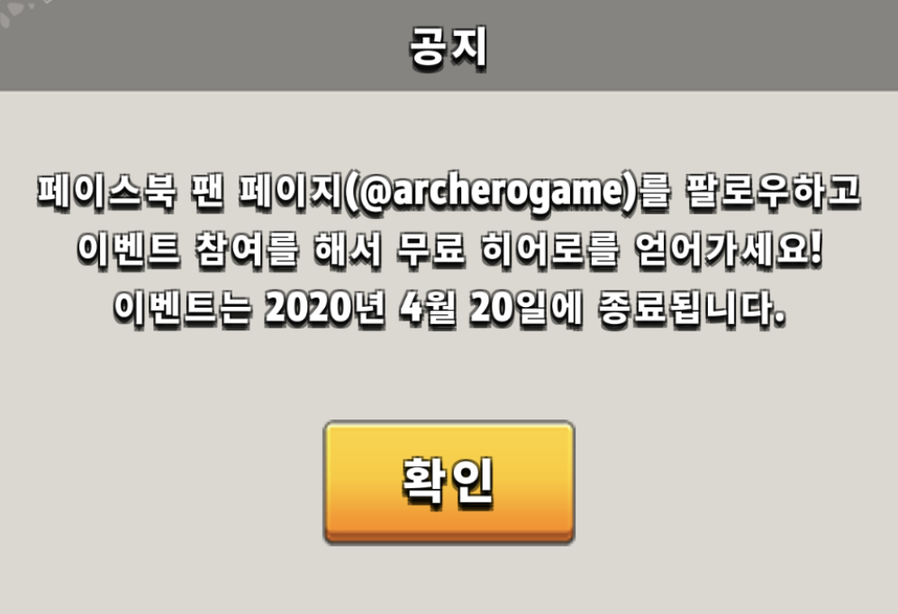' 페이스북 팬 페이지(@archerogame)를 팔로우하고 이벤트 참여를 해서 무료 히어로를 얻어가세요! 이벤트는 2020년 4월 20일에 종료됩니다.'라고 나와있습니다 오늘이 4월 10일이니까 10일 남았네요. 한정판 영웅이라고 볼 수 있겠습니다.