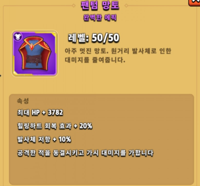 발사체나 충돌 시 대미지를 줄여주는 황금 흉갑입니다. 전체적인 대미지를 줄여주기 때문에 +5%로 낮은 수치이며 확실히 손재주의 조끼나 팬텀 망토에 비해서 부족한 느낌입니다. 보이드 로브처럼 외면받는 방어구이며 에픽 능력 또한 특별한 것이 없어 잘 사용하지 않는 방어구입니다.