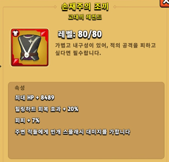 궁수의 전설 방어구(갑옷) 1티어 손재주의 조끼입니다. 고대의 레전드 풀강 시 무려 최대 HP +8489로 높은 등급의 방어구를 착용하는 것을 권장하는 이유입니다. 손재주의 조끼는 목걸이를 설명할 때와 맥락이 조금 비슷한데 대미지 저항 5+%의 황금 흉갑이나 발사체 저항+10% 의 팬텀 망토, 그리고 충돌 대미지 저항+10%의 보이드 로브와 다르게 회피 +7%의 고유 능력을 갖고 있습니다. 황금 흉갑은 전체적인 대미지 저항이지만 +5%로 효과가 아주 낮고 회피는 발사체 혹은 충돌처럼 특정 상황이 아닌 단순 피격 시이므로 전체적으로 사용할 수 있으나 회피 발동 확률이 존재한다는 단점이 있으며 대미지 저항처럼 상시 발동 개념은 아니지만 회피 효과를 보았을 때 대미지를 입지 않는 장점이 있는 옵션입니다. 발사체 저항이든 충돌 저항이든 +10%의 효과는 1000 대미지를 900 대미지로 줄여주는데 크게 체감할 수 있는 부분이 아니라서 손재주의 조끼가 가장 인기가 많은 것 같습니다. 하위 낮은 챕터 그리고 낮은 등급의 아이템을 착용하고 있는 경우 회피 발동 확률이 낮은 것은 사실이지만 영웅 레벨업 작업이 잘되어 있거나, 사용하는 있는 장비, 영웅에 따라 시너지 효과를 볼 수 있으며 상위 챕터로 갈수록 빛을 볼 수 있습니다. 또한 유저들이 고유 옵션에 중점을 두고 방어구를 착용하는 이유는 에픽 옵션이 주는 능력이 상위 챕터에서 큰 도움을 느끼지 못하는 게 가장 크다고 생각합니다.