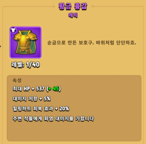 일단 방어구는 무기와 다르게 가장 높은 등급의 아이템을 착용하는 게 가장 효율적입니다. 공통적으로 붙어있는 기본 능력인 최대 +HP가 아이템 등급별로 상당한 차이가 나기 때문인데 고유 능력과 에픽 능력이 많은 양의 HP보다 큰 효율을 보이지 않습니다. 방어구 공통으로 기본 옵션인 최대+HP, 레어 옵션 레드 하트의 힐링 효과 +20%가 붙고 방어구마다 다르게 붙는 '고유 옵션'과 에픽 등급부터 '에픽 옵션'이 존재하는데 대체적으로 많은 유저들이 '고유 옵션'에 중점을 두고 방어구를 착용하고 있습니다.