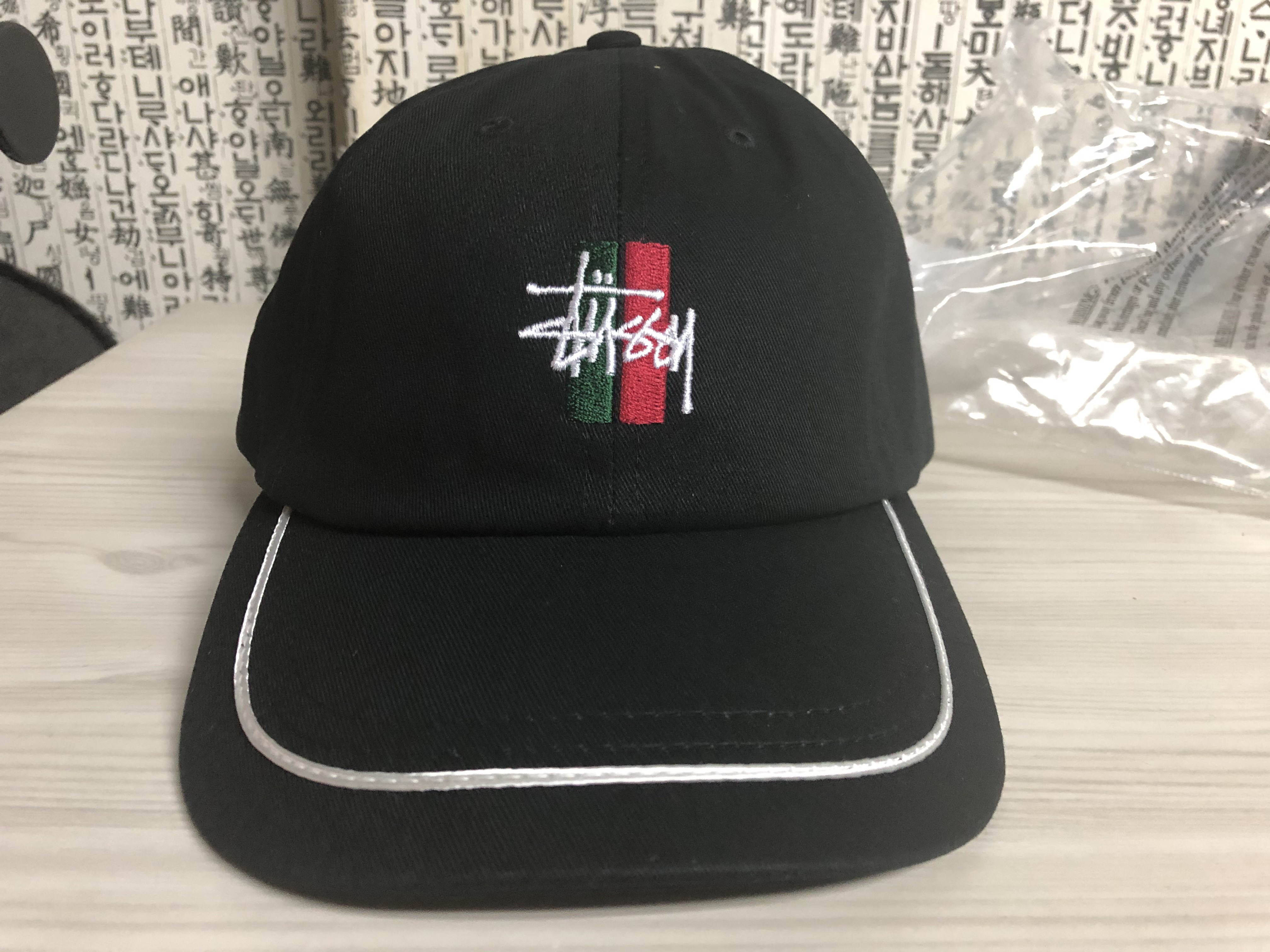 검은색 바탕에 흰색 스투시 로고의 볼캡은 짜증 날 정도로 가품이 많습니다. 볼캡에 스투시 로고를 붙여 판매하는 것이 합법인 건지 규제를 안 하는 건지 모르겠지만 국내 네이버 쇼핑, 쿠팡, 위메프, 옥션 등 아주 다양한 곳에서 1만원 초반에 가품을 판매하고 있습니다. 저는 가품이 많은 스투시 기본 볼캡과 차별화를 두고 싶어서 디자인 있는 제품을 선택했는데 제가 구매한 제품은 '구찌 맛 볼캡'이라고 불리는 제품이에요. 이유는 스투시 로고와 함께 구찌에서 자주 사용하는 그린 색상과 레드 색상의 포인트가 되어 있어서 그렇다고 하는데 구찌 느낌이라는 것인지 구찌를 모방한 것인지 왠지 모를 찜찜함이 있었습니다. 저는 흰색 라운드로 포인트를 준 디자인이 이뻐서 구매했는데.........