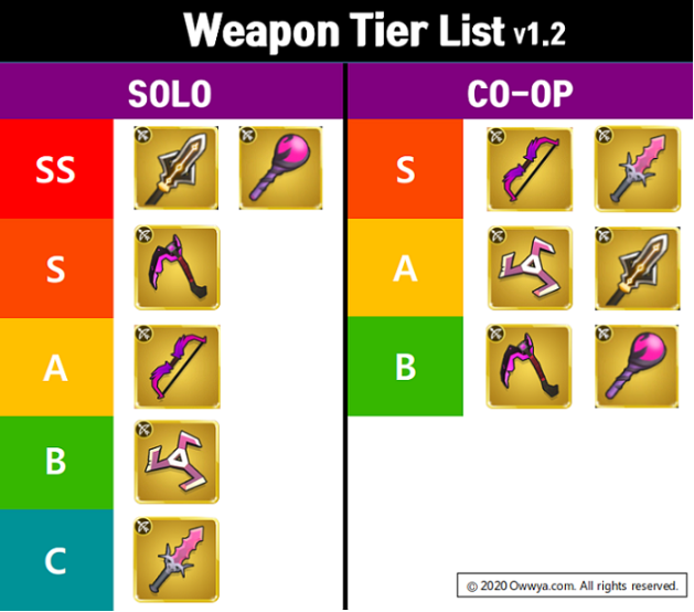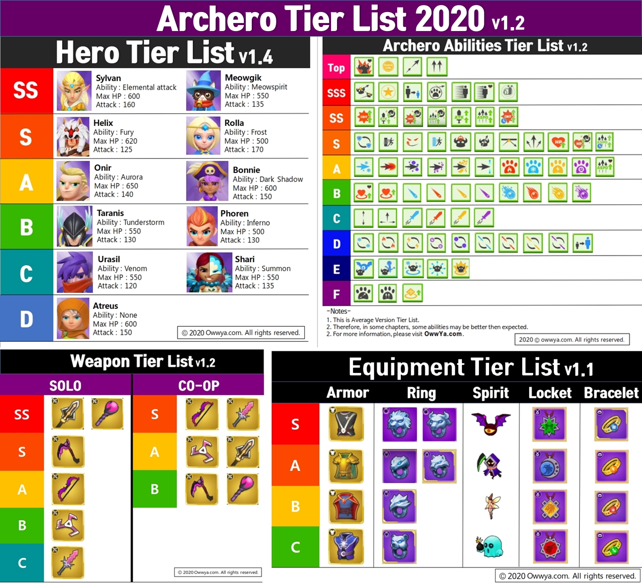 해외 게임 커뮤니티 owwya에서 2020년 4월 28일에 업로드한 궁수의 전설 티어 등급표 자료입니다. (Archero Tier List 2020 v1.2) 따끈따끈한 최신자료예요. 여기서 정리한 자료는 영웅, 어빌리티, 무기, 방어구, 반지, 펫, 목걸이, 팔찌 모두 정리해놨으며 심지어 솔로(Solo), 듀오(Hero Duo) 무기 티어까지 순위를 정해놨습니다. 이 순위와 별개로 유저들에게 투표를 진행하였는데 이 자료와 다른 결괏값이 나온 것을 보니 어떤 기준으로 작성한 자료인지 모르겠네요. 저는 이 자료를 토대로 '국내 커뮤니티 유저들의 생각'과 어떻게 다른지 알아보고 저의 생각도 첨부하여 작성해보겠습니다.