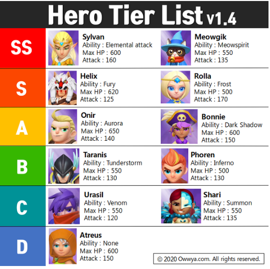 국내 커뮤니티에서 과금 영웅은 실반. 무과금 영웅은 헬릭스가 진리입니다. 여기 해외사이트 자료에서는 헬릭스보다 냐옹혼을 더 좋다고 정하였네요. 냐옹혼 잠수함 패치로 하향된 것은 아는지 여전히 최상위 티어로 분류하고 있는 모습인데 저는 패치 전 냐옹혼을 더 선호했지만 패치 후 헬릭스가 확실히 좋다고 생각합니다.