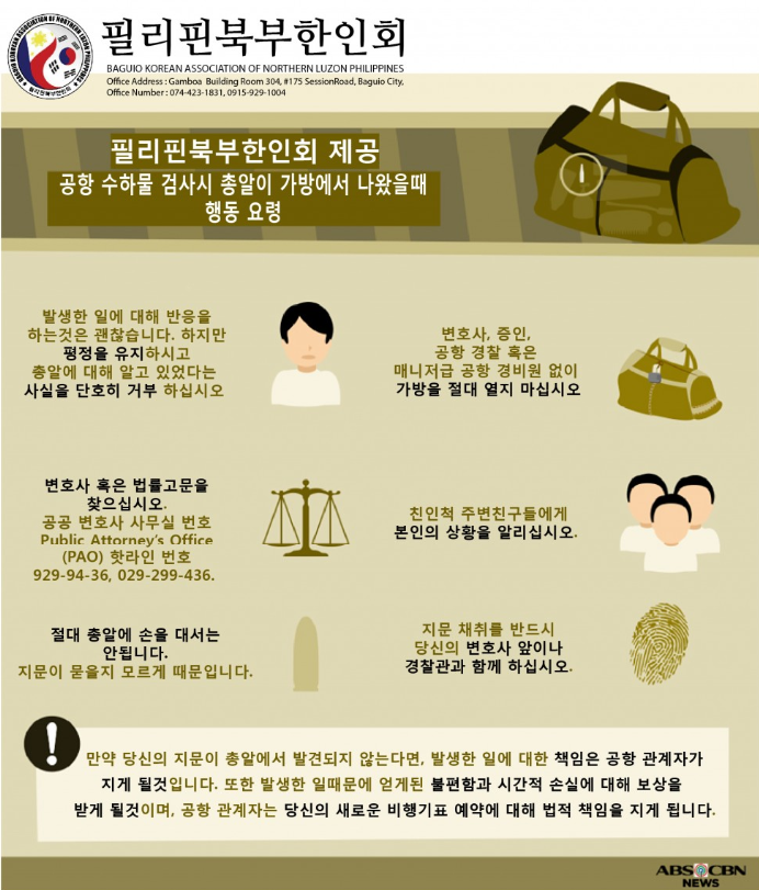 위 자료는 '필리핀 북부 한인회'에서 만들어준 자료로 공항 수화물 검사 시 총알이 가방에서 나왔을 때 행동요령입니다.