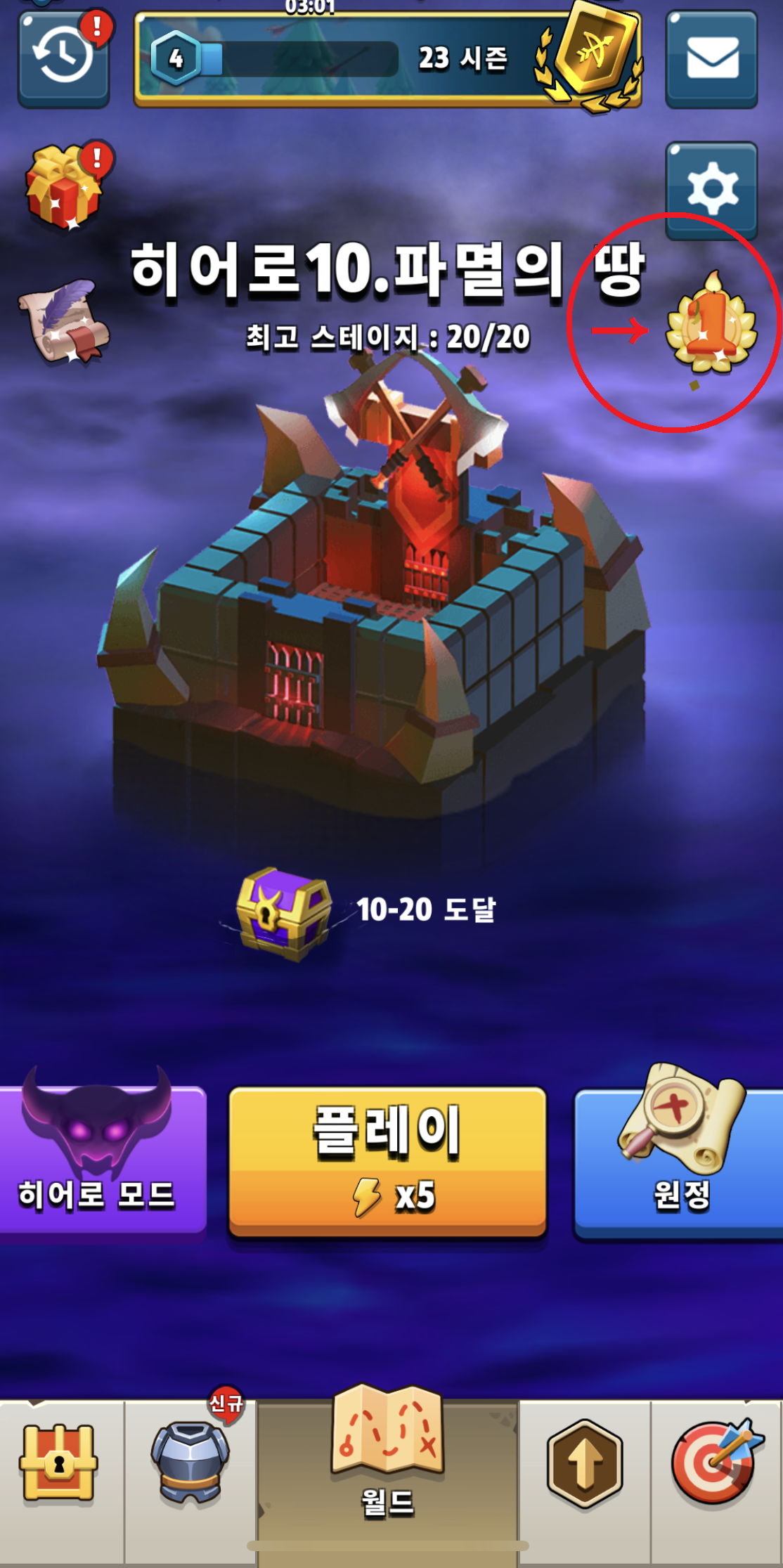 (메인 페이지에서 원정 버튼이나 왼쪽 상단 1 버튼이 없다면 업데이트를 해야 합니다.)