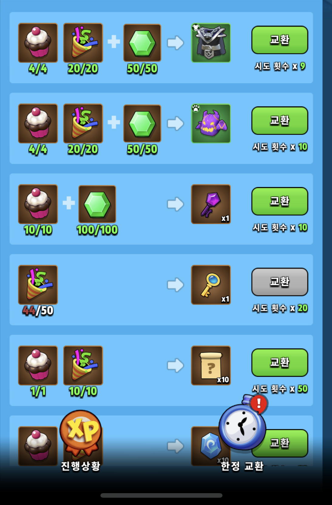 왼쪽 상단 숫자 1 버튼을 누르고 하단 '한정 교환'을 눌러주세요.