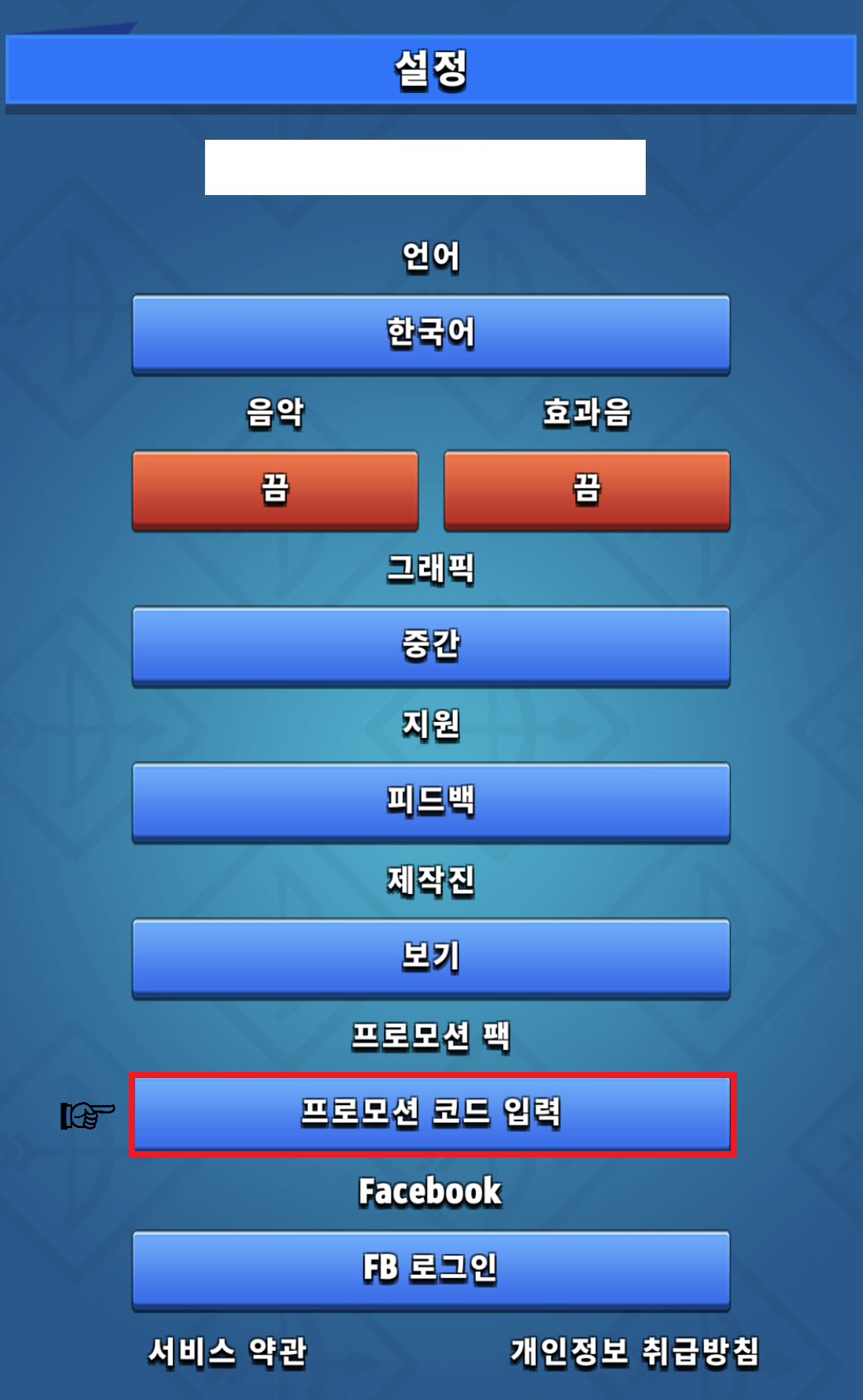 메인화면 내 톱니바퀴(설정)을 클릭하여 프로모션 코드 입력을 클릭합니다.