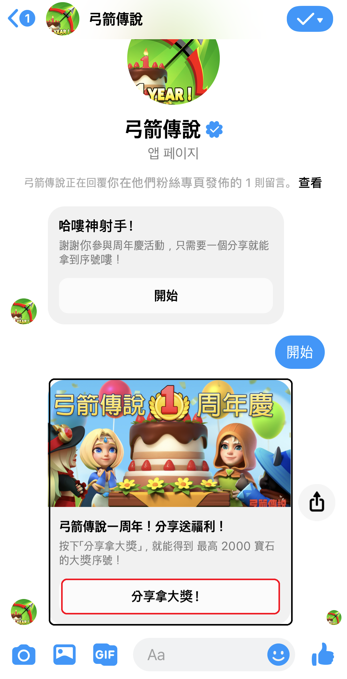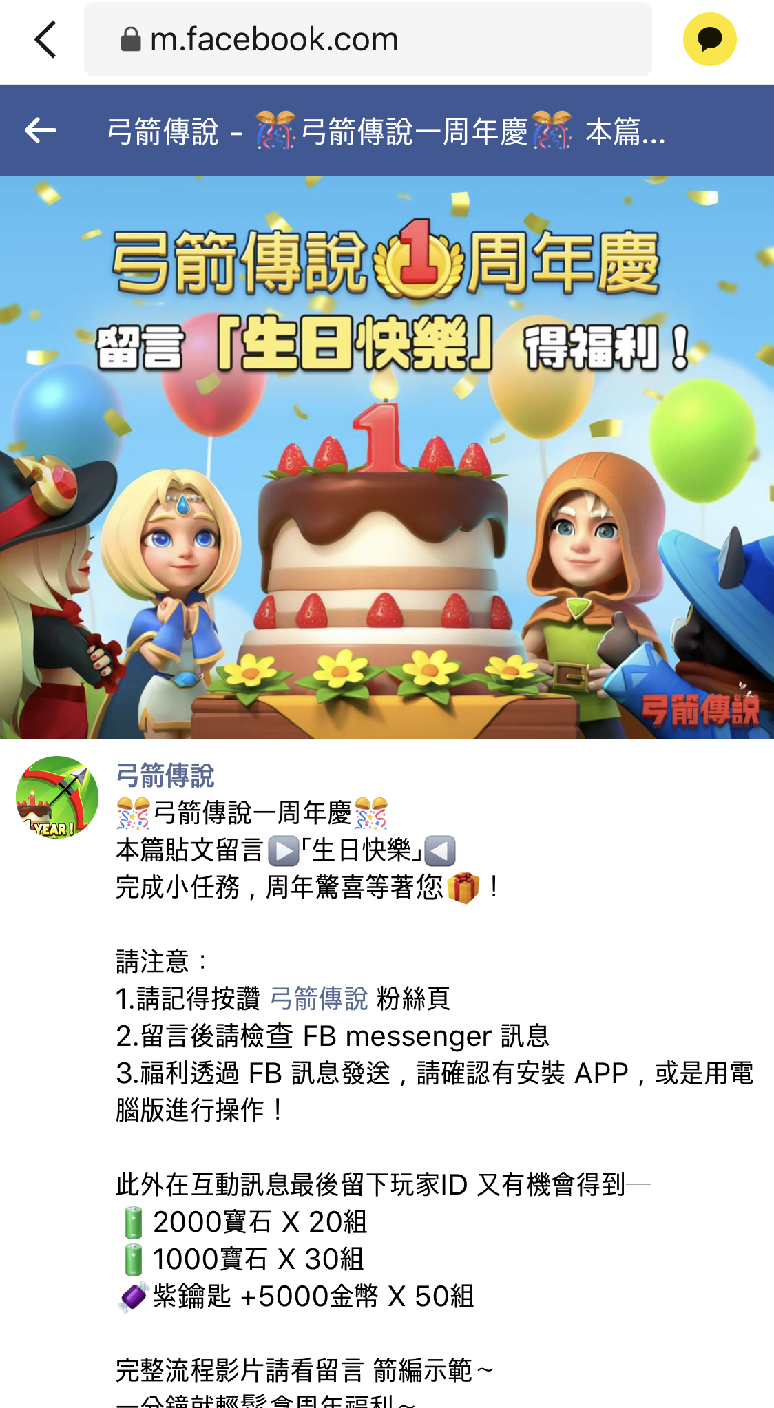 🎊弓箭傳說一周年慶🎊 本篇貼文留言▶️「生日快樂」◀️ 完成小任務,周年驚喜等著您🎁! 請注意: 1.請記得按讚 弓箭傳說 粉絲頁 2.留言後請檢查 FB messenger 訊息 3.福利透過 FB 訊息�