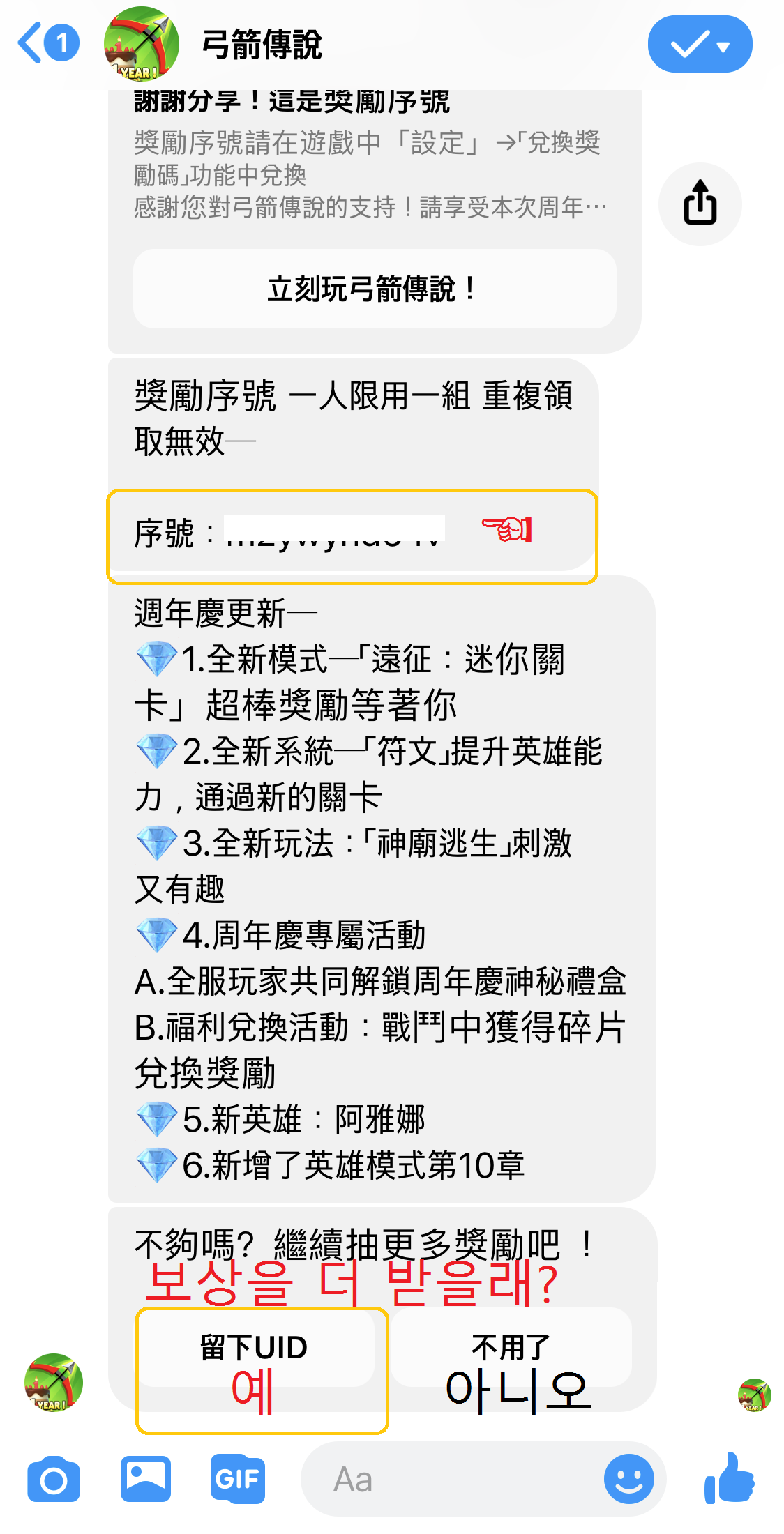 공유가 완료되면 쿠폰번호와 궁수의 전설 1주년 업데이트에 대한 설명을 해줍니다. 최하단 보상을 더 받을거냐는 질문에 ' 예 '를 눌러주세요