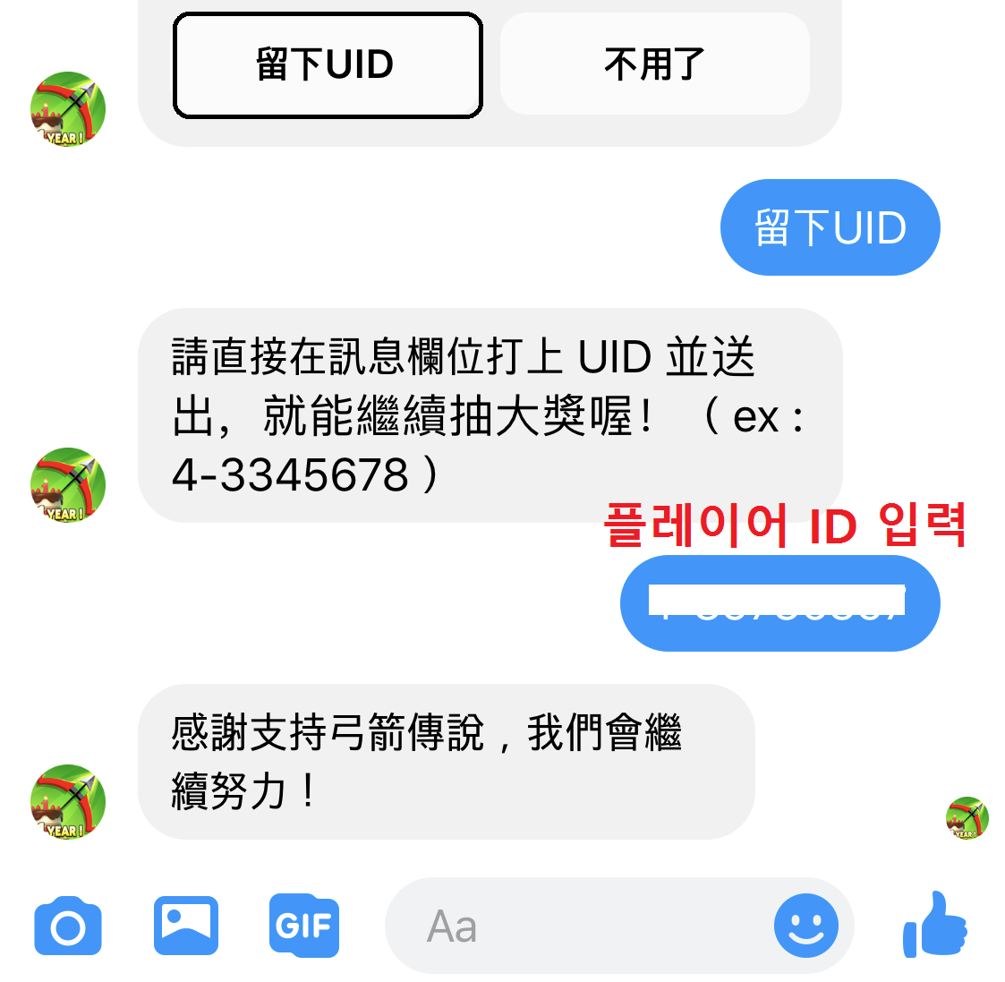 보상을 더 받을거냐는 질문에 예를 눌렀다면 궁수의 전설 플레이어 ID를 입력하면 끝입니다. 플레이어 ID는 궁수의 전설 메인화면에서 오른쪽 상단 톱니바퀴(설정)에 들어가면 최상단에 나와있어요. *(EX ) 플레이어 ID : 1-12345678,) 랜덤으로 추첨하여 2000 보석(20명), 1000 보석(30명), 흑요석 상자 + 5,000 코인(50명) 총 100명에게 상품을 준다고 합니다. (당첨자에게 쿠폰번호를 발송해주는 게 아닌 보상 메시지 발송) 확정적으로 받을 수 있는 황금 상자 1개와 2,000 코인..보상은 큰 것은 아니지만 재미로 해보는 것도 나쁘지 않을 것 같습니다~!! 끝