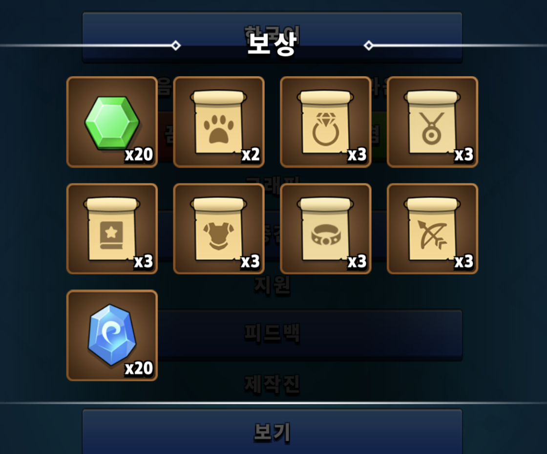 보상 : 보석 20개, 랜덤 스크롤 20개, 사파이어 20개