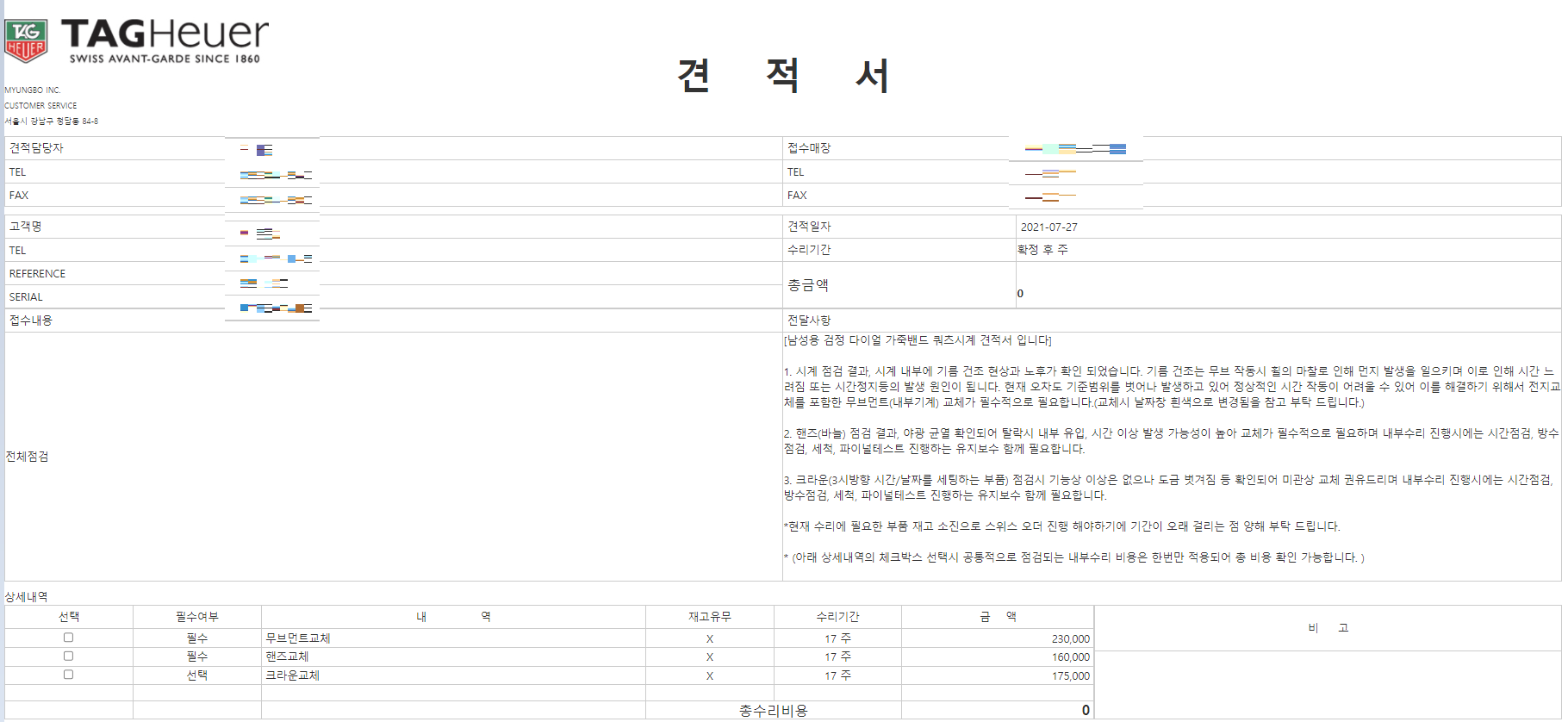 저는 수집했던 빈티지 태그호이어 프로페셔널 모델 두 점을 점검을 맡겼습니다. 쿼츠도 마찬가지로 일오차가 발생하기 때문에 무브먼트 점검이 필요하다고 생각했고 수년간 보관만 해왔으므로 배터리 교체가 필요하다고 생각했기 때문입니다. 제품 한개 견적서를 확인했는데 이런... 배보다 배꼽이 더 커져버렸습니다. 쿼츠모델이지만 시계 내부에 기름건조 현상과 노후가 확인되어 오차가 기준범위를 벗어났고, (일오차가 얼마인지, 기준범위가 몇초인지 설명이 있었으면..) 핸즈(바늘) 야광 균열 문제와 용두까짐이 문제가 있었는데 옛날 제품이다 보니.. 재고가 없어 스위스에서 받아서 수리해야하므로 17주가 소요됩니다.. 수리시 공통적으로 진행되는 것들은 점검 비용이 차감되나 그 마저도 비싸게 느껴졌네요. 수리를 해야할지 다시 반송받아서 보관해야할지 고민이 드는데... 제가 맡겼던 시계 건적서가 도착한 것을 보니 두점 모두 정품은 맞았네요.. 뭐 가품이라고 생각하진 않았지만...