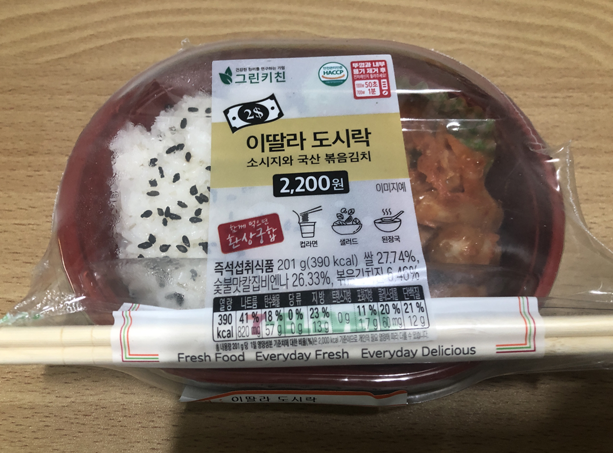 이딸라는 2달러를 의미하는 듯하고 도시락 가격은 2,200원에(2달러 환율 =2302원ㅋㅋ) 판매가 됩니다. 다른 도시락 대비 50% 저렴하여 경제적 부담이 없다고 말하지만 중량을 확인해보니 201g으로 다른 도시락 대비 50% 줄었습니다. 그러니까 양이 줄고 가격도 낮췄다고 보면 간단하겠네요.