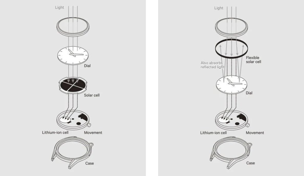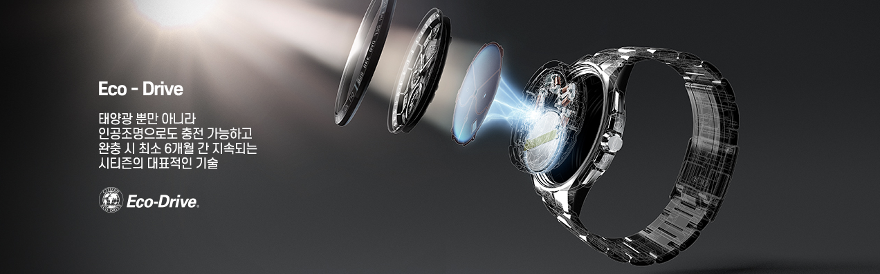 시티즌 에코 드라이브 기능은 1995년 최초로 발명되었으며 태양광뿐만 아니라 인공조명과 같은 모든 빛을 전기 에너지로 변환하여 시계를 동작시킵니다. 시계를 구동하고 남은 전기는 충전 방식의 전지에 저장하는 방식이죠. 최대로 충전시킨 경우 오토매틱의 파워리저브처럼 짧지 않고 몇 개월은 암흑 속에서 사용할 수 있습니다. (시티즌 홈페이지의 내용으로는 실제로 파워 세이브 기능이 장착된 일부 모델은 7년 동안 사용할 수 있다고 말합니다) 빛이 들어오지 않는 서랍이나 시계 케이스에 보관하는 경우 충전 방식 전지의 효율의 수명이 저하될 수 있으므로 보관에 유의해야 합니다 (빛이 없는 공간에 장기간 보관 시 주의)