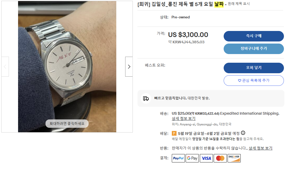 포스팅을 작성하는 현 시점. 이베이에 올라와있는 김일성 론진입니다. ETA 2836-2 범용무브먼트를 사용하고 주얼리 개수가 한글로 적혀있습니다. 25석. 이 매물이 신기한 것은 414만 원이라는 게 아닌. 판매자가 한국사람이라는 것인데 어떻게 습득하여 판매하시는지 궁금하네요. 400만 원대가 아닌 40만 원대라면 소장용으로 하나 구매하고 싶은데... 아무리 그래도 3100달러, 414만 원은... 돈을 더 보태서 론진 마제텍을 살 것 같습니다.
