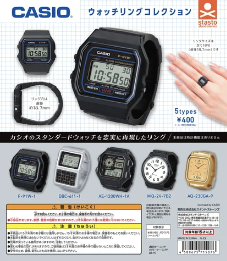일본의 시계 제조업체 카시오에서 장난감 제조업체인 'Stasto Stand Stones'와 협력하여 카시오 시계 반지 컬렉션을 출시하였습니다. 캡슐 기계에 담여 개당 400엔(약 3600원)에 개별 판매되었다고 하며 카시오의 베스트셀러모델로 구성되었습니다. 한국 쇼핑몰에서는 개당 5천 원에 판매되고 있고 시간이 움직이는 게 아닌 플라스틱 재질의 시계 모형 반지일 뿐이니 구매하시는 분들은 참고하시길 바랍니다. 저는 일본사이트에서 개당 400엔에 주문했으나 배송비가 1만 원이었어요.(ㅠㅠㅠㅠ)