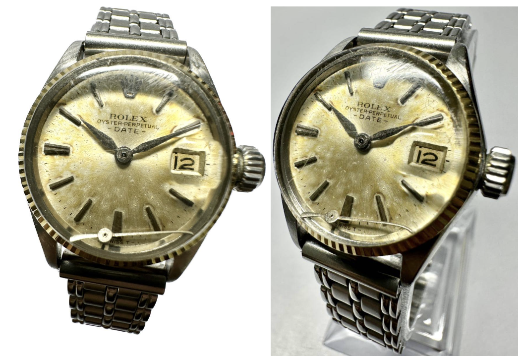 위 사진은 여성용 롤렉스 6517 오이스터 데이트 모델로 전체적인 상태가 좋지 않음에도 불구하고 경매 시 고가에 낙찰 될 것입니다. 이유는 다이얼 재생, 글라스 교체, 오버홀, 브레이슬릿 교체, 폴리싱을 진행하면 다시 고가에 판매될 수 있기 때문이죠. 물론 25mm 작은 사이즈의 여성용 모델로 30mm 중반 남성모델처럼 비싸게 받진 못하겠지만요