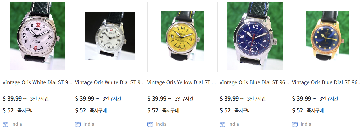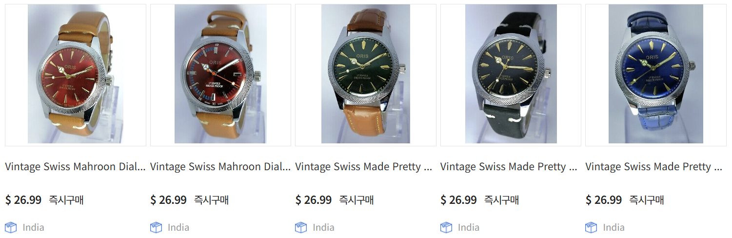 전 세계에서 유통되는 가품 시계 브랜드 1등은 단연 롤렉스인데요. 중국, 홍콩산 저렴이부터 어느 가품 공장의 파츠들이 사용되었는지에 따라 시세가 형성되어 있을 정도죠. 아무튼 롤렉스'의 경우 가품을 정품이라고 속여 판매하는 사기꾼은 거의 없지만 오리스는 가품이 '빈티지 정품'으로 둔갑되어 판매되고 있어, 글을 작성하게 되었습니다. 이 오리스 가품 시계는 인도에서 생산되어 해외 유명 오픈마켓에 유통되는데 가격이 정말 저렴하기 때문에 시계를 잘 모르는 사람들의 구매가 이루어지는 것 같아요. 뭐 시세 차익을 얻기 위해 구매하시는분들도 있는 것 같기도 합니다. 인도에서 생산된 가짜 제품은 오리스뿐만 아니라 예거 르쿨트르, 브라이틀링, 포티스, 세이코, 시티즌, 론진, 율리스 나르딘, 라도, 등 아주 다양합니다.