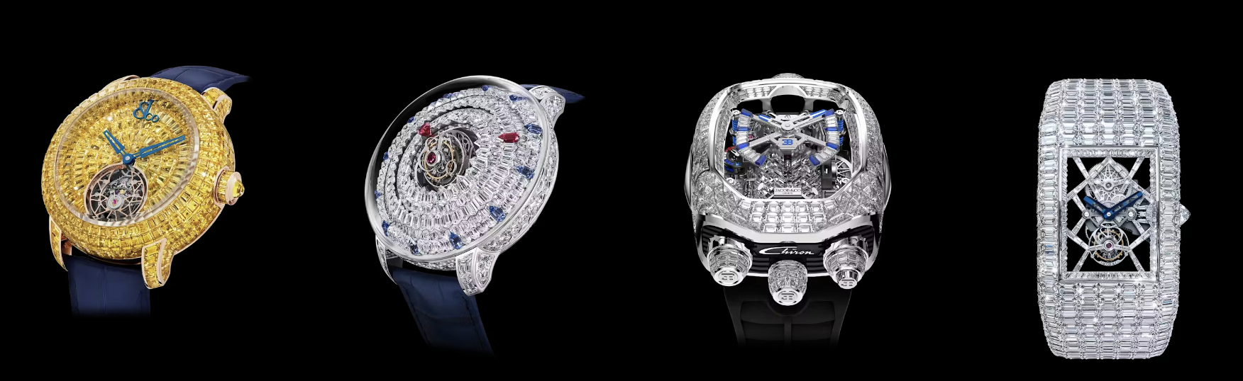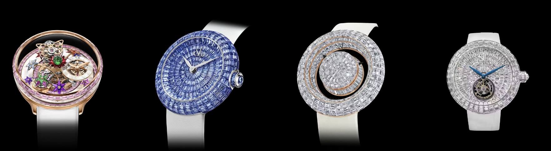 제이콥앤코는 주얼리로 시작한 회사답게 주얼리 기술을 접목한 화려하고 혁신적인 디자인을 보여주고 있으며 뚜르비옹, 미닛리피터 등 초고급 컴필레이션을 구현하였으며 다양한 소재를 사용하여 시계를 생산합니다. 사파이어 크리스털을 이용하한 투명케이스도 만들기도 했죠.(Astronomia 라인), 최고급 시계 시장을 겨냥한 고가의 제품을 만들고 있으며 시계를 단순 시계의 용도보다 예술 작품으로 접근하여 생산하는 게 특징이며 제이콥앤코는 전통적인 시계 브랜드들과는 달리, 대담하고 혁신적인 접근으로 럭셔리 시계 시장에서 자신만의 독특한 위치를 확립하고 있습니다. 전세계에서 가장 비싼 시계 브랜드가 아닐까 생각이듭니다. 그뢰벨포지도 뺨 후려치는...??