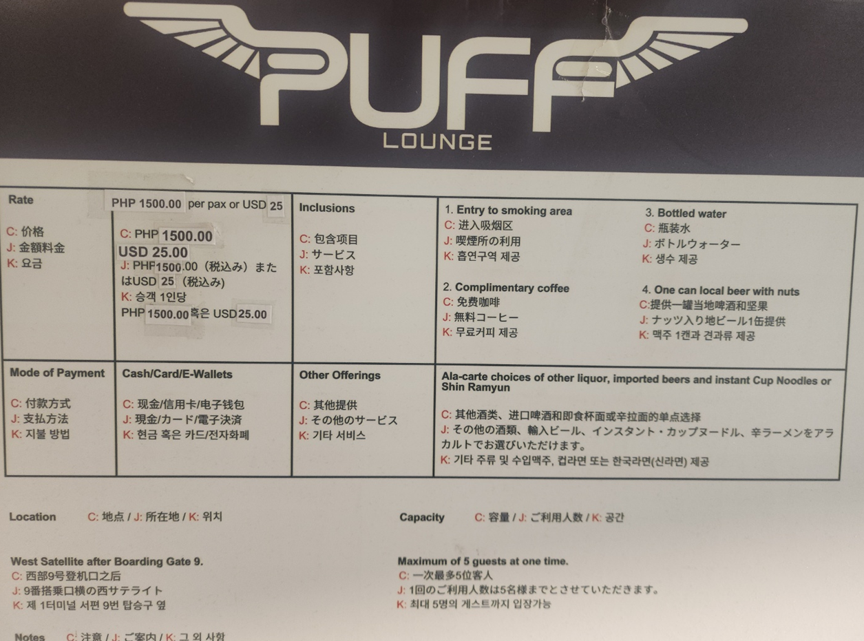 일반적으로 생각하는 공항 라운지가 아닙니다. 간단 명료하게 말씀드리면 흡연 공간입니다. 여기 라운지는(PUFF) PAGSS에서 운영하고 있는데 PAGSS 라운지를 이용한다고 해도 돈을 지불해야 흡연이 가능합니다. 어이없음
