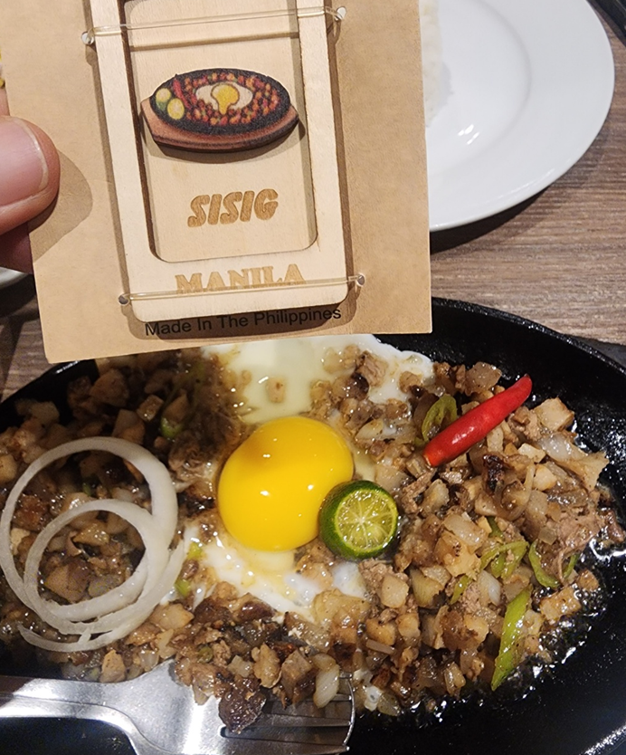 시식은 필리핀을 대표하는 음식이자 제가 가장 좋아하는 필리핀음식입니다. 시니강은 진입장벽이 높지만 시시그는 한국사람들도 다 잘 먹고 좋아하더라고요. 이 요리는 주로 돼지머리(볼, 귀, 주둥이 등)와 닭 간을 주재료로 하여 필리핀 라임, 양파, 고추 등으로 간을 한 후 뜨거운 철판에 올려, 익혀먹는 음식입니다. 댤걀도 하나 넣어 비벼 먹으면 부드럽고 더 맛있습니다. (달걀은 거의 다 넣어주는 듯) 팜팡가 지역에서 유래된 요리로 지금은 필리핀 전역에서 인기가 많고 식당에서는 밥반찬으로, 술집에서는 술안주로 나오며 바삭하고 쫄깃한 식감, 신맛과 매운맛이 어우러진 풍미가 있습니다.