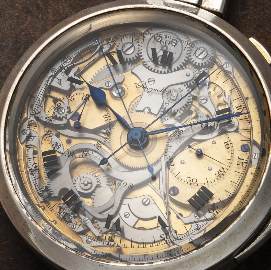 미닛 리피터의 역사를 말씀드리면 17세기 후반 영국의 시계 장인 다니엘 쿼어가 최초의 리피터를 개발했고 18세기 아브라함-루이 브레게(우리가 아는 브레게 맞습니다)가 기술을 정교하게 발전시켰으며 1750년경 존 엘리콧과 토머스 머지가 미닛리피터(시, 15분, 분까지 소리로 알림)를 완성했다고 합니다. (당시 시간(시)과 15분 단위인 쿼터 리피터였음) 1820년 브레게가 'all-or-nothing) 메커니즘을 도입해 슬라이드를 끝까지 밀지 않으면 작동하지 않도록 하여 안정성을 높였고 이후 고급 회중시계에 주로 적용되다가 20세기 들어 손목시계로 발전했습니다.