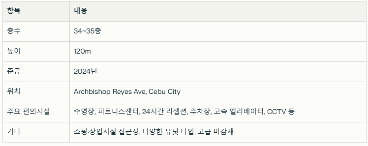 모알보알이나 오슬롭, 캐녀닝 등 세부 투어는 어딜 가든 멀기 때문에 교통-생활 인프라가 잘 갖춰진 지역인지 확인해야 합니다. 주변에 마트, 식당, 환전소, 병원 등 편의시설이 있는지 지도와 후기를 참고하면 좋죠. 시티스케이프 타워는 편의점도 주변에 많고 아얄라몰이 매우 가깝습니다. 그 외 세부 IT 파크 혹은 푸엔테 오스메냐 서클(망고 에비뉴 근처) 위치도 좋습니다