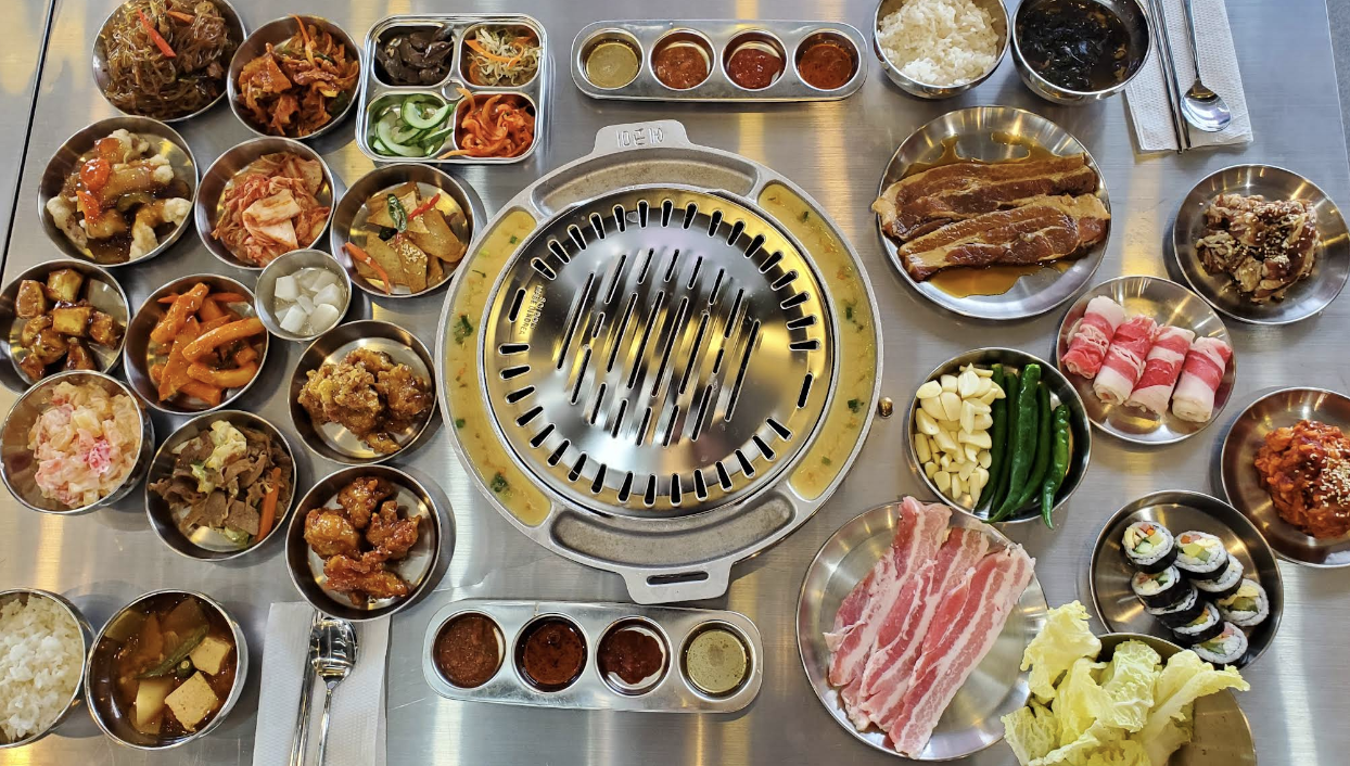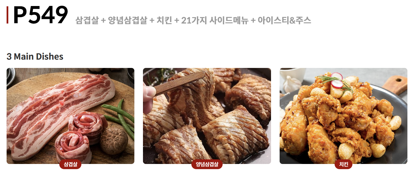 549페소 + 삼겹살 + 양념삼겹살 + 치킨 + 21개의 반찬 + 아이스티 & 주스