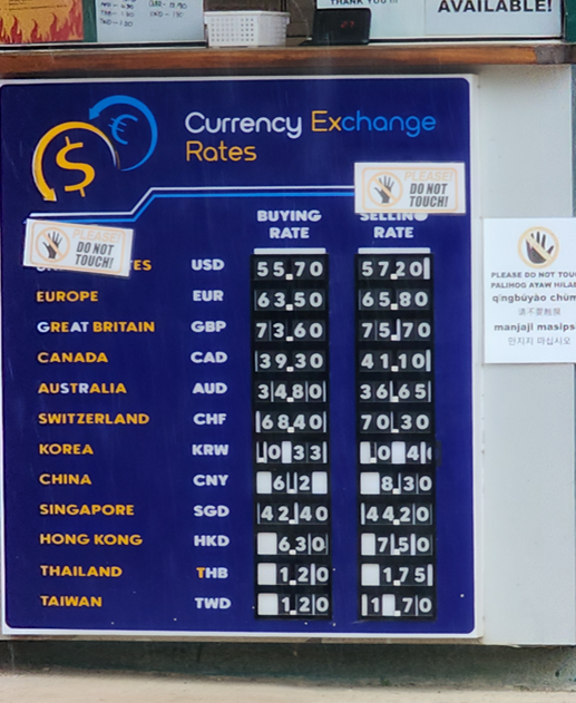 ++ 300만원이상 출금을 한다면 ATM 출금이 아닌 한국에서 달러를 환전하여 보홀 환전소에서 환전하는 게 더 유리합니다. 금액이 커지면 커질수록 ATM 출금이 수수료 때문에 불리하고 아래 사진처럼 보홀 사설 환전소의 환율도 괜찮기 때문입니다. 보홀에서 100만 원을 쓰겠다. 하면 이중환전할 필요 없이 ATM 출금을 정말 추천합니다~!!!