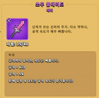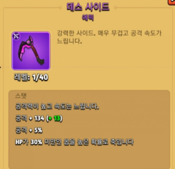 낫이라고 불리는 데스 사이드입니다. 신규 무기가 나오기전에 부메랑과 최고의 인기를 누린 무기이며 공격 속도는 아주 느리지만 공격력이 높고 30% 확률로 몬스터 즉사 그리고 넉백, 적을 밀쳐냄 기능이 있습니다. 공격 속도는 어빌리티로 어느 정도 커버가 가능하며 챕터가 올라갈수록 무기의 공격력이 아주 중요하기 때문에 3위에 랭크하였습니다. 아주 낮은 공격 속도로 활이나 쏘우 블레이드를 사용했던 유저들은 답답해서 사용하지 못하는 무기입니다.